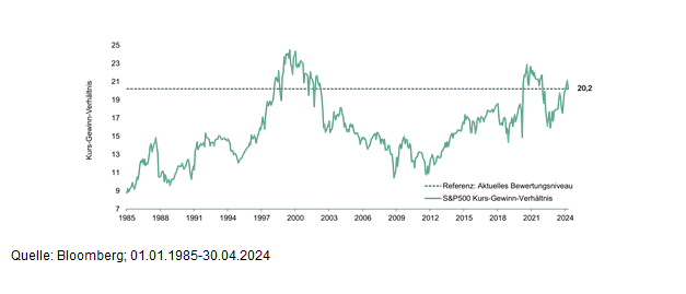 Die Berichtssaison in den USA verläuft überraschend positiv. Das haben auch die Marktteilnehmer honoriert und sich entsprechend an den Märkten positioniert. Doch nach den jüngsten Kurssteigerungen rücken auch die Bewertungen der börsennotierten Unternehmen stärker in den Fokus. Bis Ende März 2024 ist das Kurs-/Gewinn-Verhältnis (KGV) im Aktienindex S&P 500 auf 21,1 gestiegen und dann auf 20,2 zurückgegangen (siehe Abbildung). Jetzt liegt es an den Unternehmen, dieses ambitionierte Bewertungsumfeld durch einen Anstieg ihrer Gewinne zu rechtfertigen. Darauf werden die Investoren nun verstärkt achten.