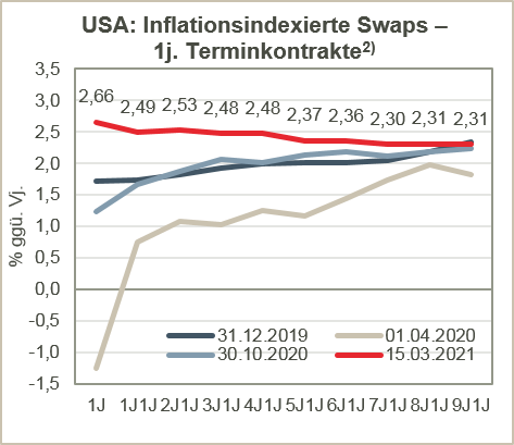Das Risiko für diese Prognosen liegt eindeutig am oberen Rand, da sowohl die EZB als auch die FED im März 2021 angekündigt haben, ihre expansive Geldpolitik fortzusetzen. Die EZB erklärte am 11. März, das Tempo beim Ankauf von Wertpapieren deutlich zu erhöhen. Und die FED gab am 17. März bekannt, dass sie ihre Wertpapierbestände trotz verbesserter Wachstumsaussichten und sinkender Arbeitslosenquoten weiterhin um 120 Mrd. USD pro Monat aufstocken wird. Der Konsens unter den (meisten) Politikern ist, dass es besser ist, zu viel zu tun als zu wenig, eine Lektion aus der globalen Finanzkrise 2008. Der Ökonom und ehemalige US-Finanzminister Larry Summers erwartet, dass die Wirtschaft aufgrund der expansiven Geld- und Fiskalpolitik möglicherweise überhitzen und die Inflation auf ein seit einer Generation nicht mehr gesehenes Niveau ansteigen könnte. Dies ist zwar nicht unser Hauptszenario, aber das Risiko für das reale BIP-Wachstum, die Inflation und die Zinssätze liegt eindeutig am oberen und nicht am unteren Rand.