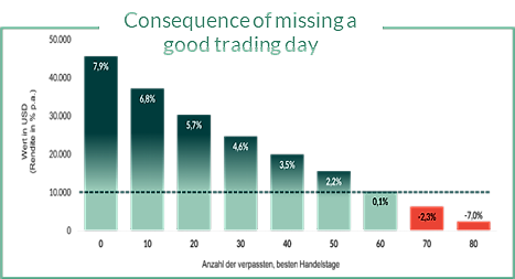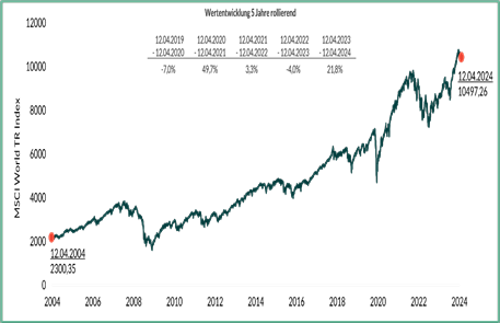 4) A few good days can be the difference between a mediocre portfolio and an outstanding one. An investor in the world equity index MSCI World Net Total Return including dividends from mid-April 2004 to mid-April 2024 was able to achieve an average annual increase in value of 7.9 percent if he was fully invested for the entire 20-year period (see chart). However, missing just the ten best trading days during this period would reduce the annual return to 6.8%. Missing the top 40 days out of these 5220 trading days would halve the annual return to just 3.5%.