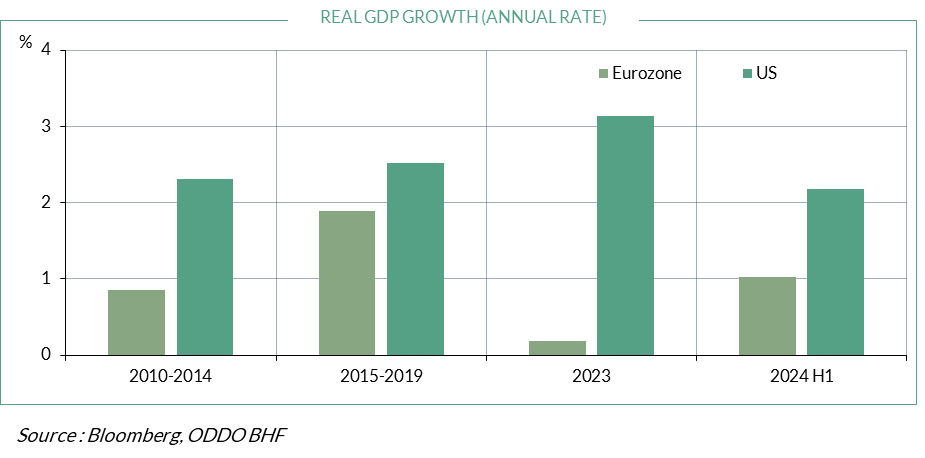 What happened to these hopes of recovery? Until the beginning of Summer 2024, the economic data were moving in the desired direction. Over the first half of the year, real GDP in the eurozone grew at an annual rate of 1%. After eighteen months of virtual stagnation, that is a sensible improvement. However, this pace is still far from the trend seen before the pandemic (1.9%). It also pales in comparison to the United States over the same period (2.2%). (chart 1)A closer look reveals that the foundations of this nascent recovery are not very solid. First, the business climate indicators show major disparities across sectors. The industrial sector, which is normally at the forefront of the cycle, is still struggling, while services continue to be buoyed by the end of the post-pandemic recovery. By definition, a catch-up after an exogenous shock cannot last forever.