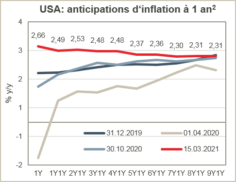 2) Source : Refinitiv Datastream, au 15.03.2021 ; contrats à terme 1 an : contrats à terme d'une durée d'un an (exemple : 3Y1Y = contrat à terme débutant dans trois ans et d'une durée d'un an).