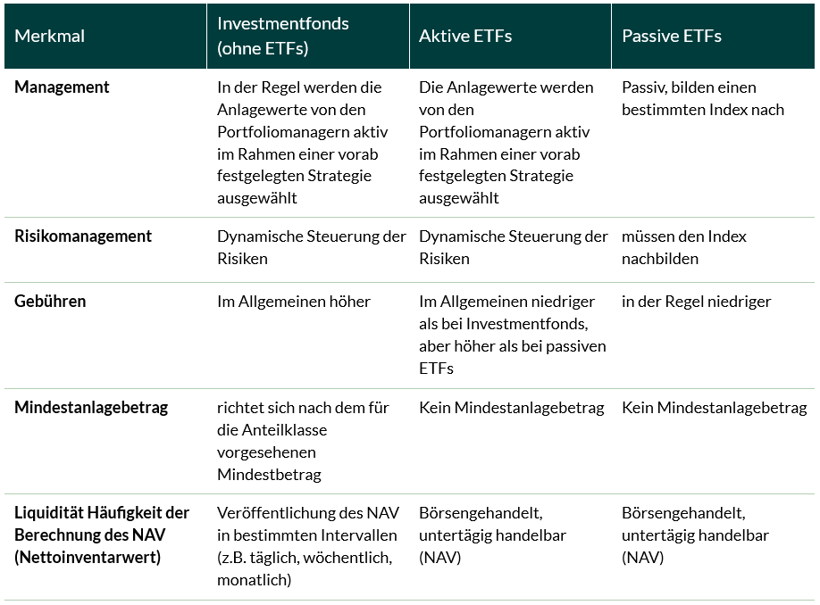 Wie unterscheiden sich aktive ETFs von einem Investmentfonds oder passiven ETFs?